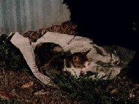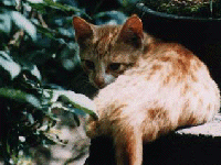 野良猫代表、あか。今年の春生まれました。兄弟に黒猫の「くろ」と黒白の「こね」が います。命名したのは母です。三匹ともオスなのですが、あかは最初メスだと思われて いたくらいおっとりしていて、大変な甘えっ子です。鳴き声も一番可愛い。しかし実は 兄弟で相撲をとると一番強いようです。ノミ持ち。 |