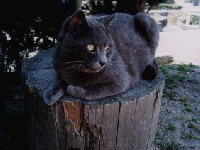 うちのねこ代表、ばかぼん(通称ぼん)です。迷い猫出身。実はうちで正式に飼ってい るのはこいつだけなのですが、野良猫たちが家の中で暮らすようになってからというも の、ご飯の時間しか家に帰ってこなくなりました。しかも抱くとうなります。写真では 去年死んだ猫の墓の上に座ってます。デリカシーなし。 |