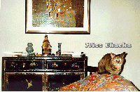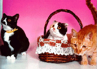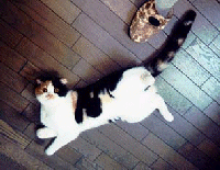 左からドラム,アイシャ,キリー. ドラム;私は趣味でバンドをやっているのですが,バンドメンバーのドラム担当の奴に そっくり(口ひげ)だったのでこんな名前にしました. 妻が路上でねずみ大の不可思議な生き物を拾ったらこんなになりました. 口ひげがありますがメスです. 写真ではわかりませんが足元が白くあのソックスに少し似ています. 性格は一番良くっていたずらもめったにしません.推定年齢は3才. アイシャ;我が家唯一の血統書つき(スコティッシュフォールド). 映画グレムリンのモグアイに似ているでしょ?三毛ですからメスです. 生まれはよい(お世話になっている獣医さんで生まれてやすく譲っていただきました) のですがまわりが野良だらけだったのであまりお嬢さんらしい行動はしません. 食欲が一番でだいぶ太ってきました.年齢は4才. キリー;唯一のオス(ただし”玉なし”). 公園で目がつぶれてうろついていたのを拾って手術してあげました. その恩義を忘れないのかなんだか人間大好き.来客を毎日待ち望んでいます. 人間を見ると凄い勢いでかけつけ首ったまに抱きつきます.まるで犬でしょ? (顔も少し変わっていて隣家の子どもにはライオンキングと呼ばれています) 小さいときの目のせいで目鼻の粘膜が弱いのが若干心配です.年齢は...5才? |